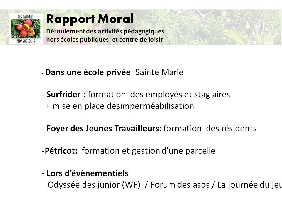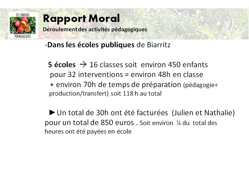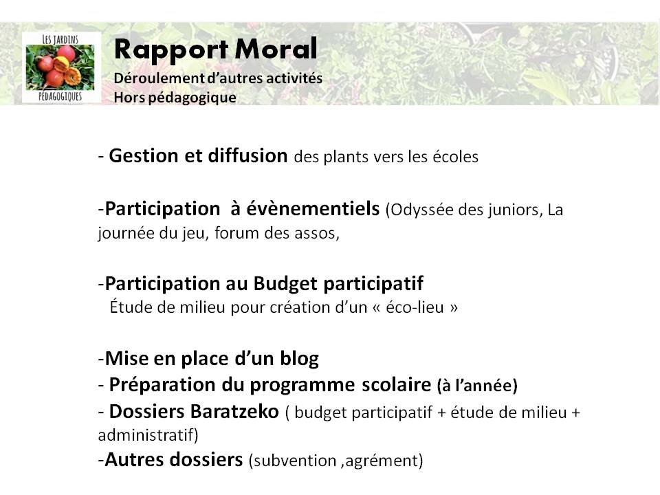 ● Les activités hors temps pédagogiques sont également à prendre en compte pour l’énumération des activités menées par les membres de LJP pour : 1) la gestion et diffusion des plants distribués aux écoles – 2) la rédaction d’un projet pédagogique et la création des outils pédagogiques pour les écoles – 3) le montage du dossier pour le Budget Participatif – 4) l’étude de milieu pour un éco-lieu à Biarritz – 5) la mise en place d’un blog – 6) la gestion de la communication sur les réseaux sociaux