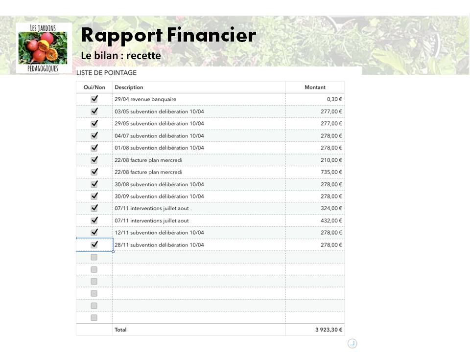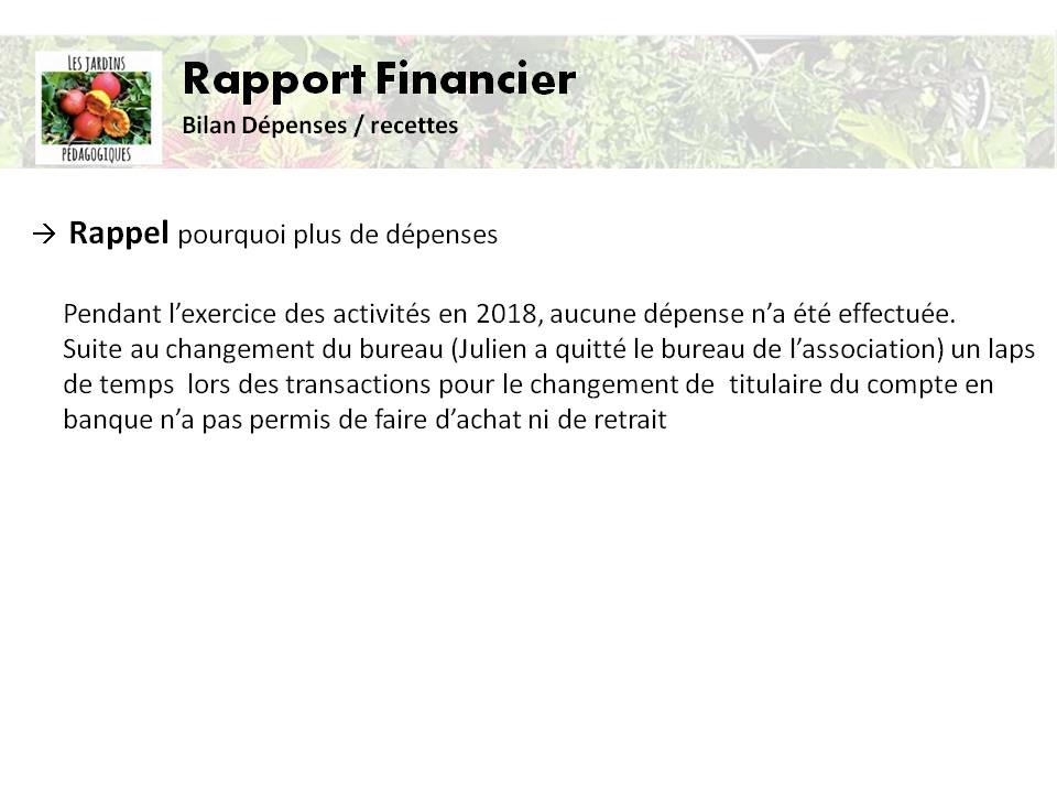 ● Le rapport financier a été présenté par Jean-Baptiste qui a commencé par rappeler les dépenses effectuées et les recettes pour conclure que le budget était équilibré bien que les dépenses plus importantes que les recettes ceci étant dû au fait que des dépenses ont été faites sur les subventions de l’année dernière ; année pendant laquelle aucune transaction n’avait été faites (suite au changement de titulaire du compte).