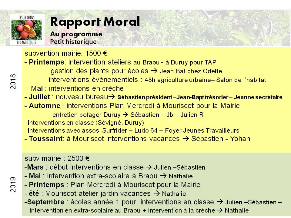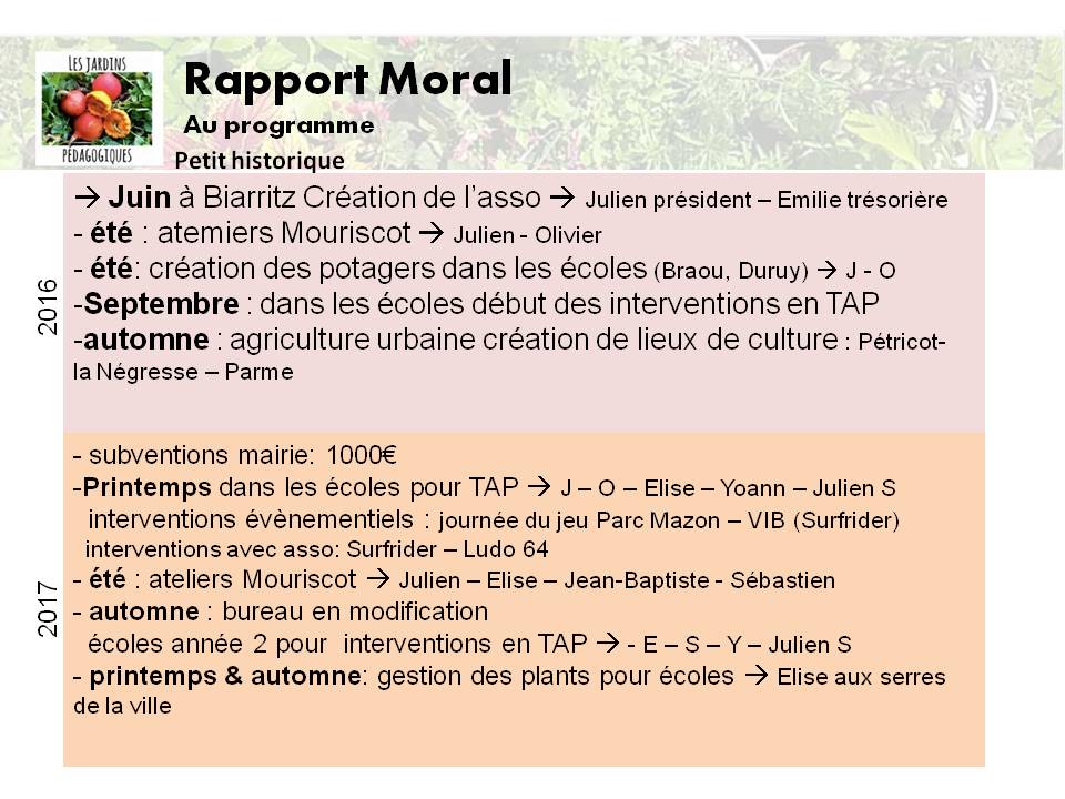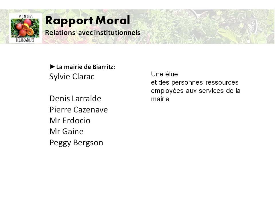 ● Il a été présenté un rappel des liens créés avec les institutions : Sylvie Clarac parmi les élus et l’équipe des services techniques qui nous soutiennent dans notre démarche de développer des lieux de cultures dans les écoles et centre de loisir de la mairie Denis Larralde, Mr Erdocio, Mr Gaine, Mr Gostinsberg, Emma Arboin directrice du centre de loisir.