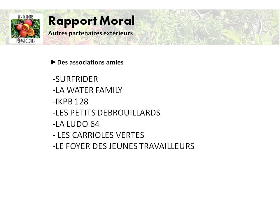 ● Avec les assos : SURFRIDER – LA WATER FAMILY – L’EPI/IKPB 128 – LES PETITS DEBROUILLARDS – LA LUDO 64 – LES CARRIOLES VERTES – LE FOYER DES JEUNES TRAVAILLEURS – dont la nature des partenariats a été rappelée.