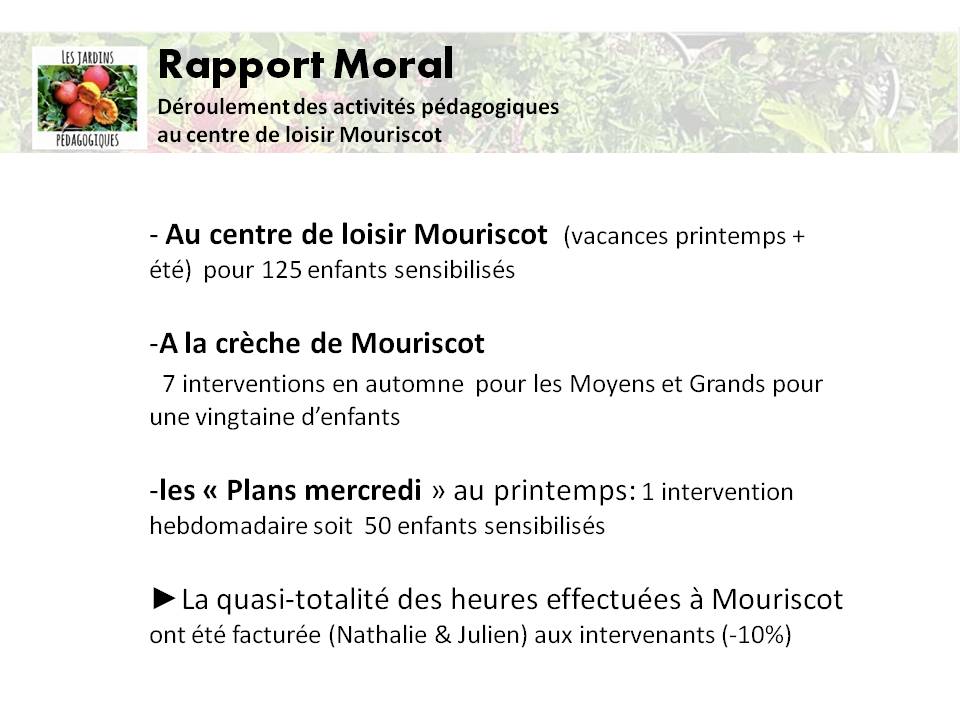 ● Les activités menées à Mouriscot sont divisées en 3 entités distinctes : 1) Les activités dans le cadre du centre de loisir lors des vacances scolaires, 2) lors des « Plans Mercredi » et 3) la crèche. Pour ces interventions l’association facture auprès des différents services (respectivement Emma Arboin directrice de l’ASLH, Denis Larralde responsable éducation à la mairie et Julie directrice de la crèche). Pour ces interventions les intervenants (essentiellement Nathalie) facturent de 28 à 35€/h à l’association en laissant 10% du total facturé à LJP.