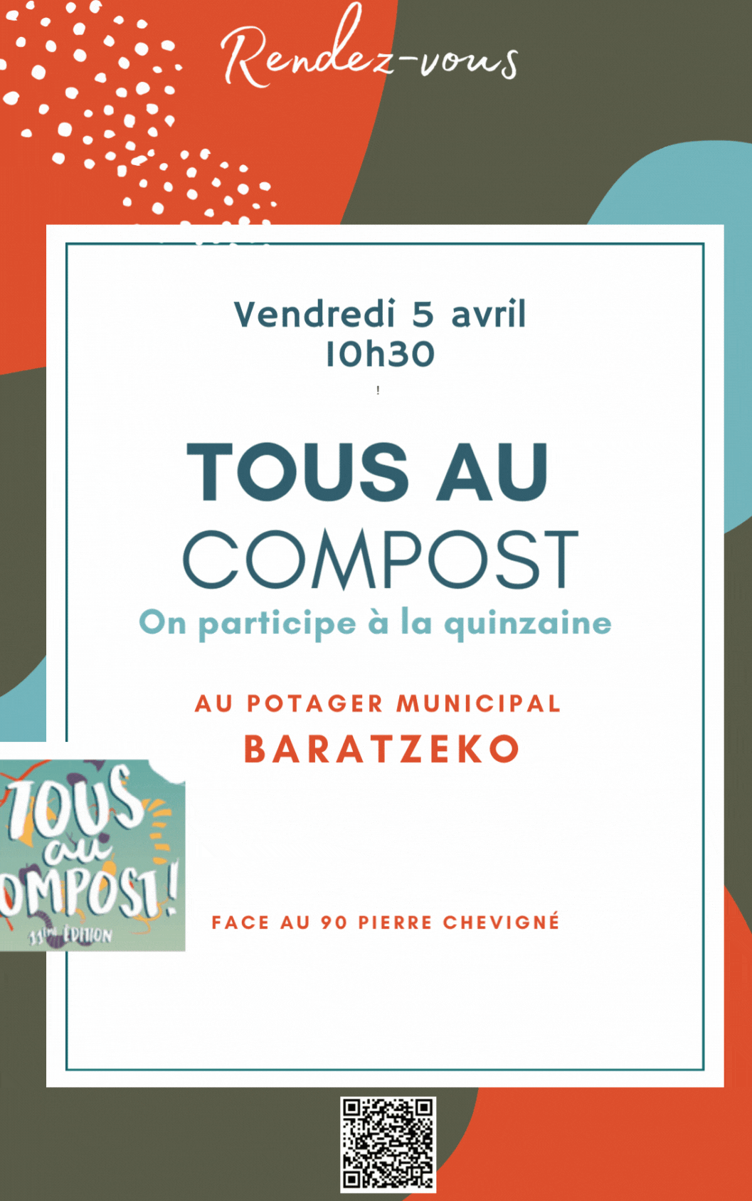 - Le 5 AVRIL: On se retrouve quand même dans la quinzaine du compost, c’est pourquoi cette activité du vendredi (s’il ne pleut pas) tournera autour de notre composteur (qui fête sa toute 1ère)! Nous vous présenterons le béa-ba de la gestion d’un composteur individuel. Nous vous proposerons également de partager avec vous notre expérience de la gestion d’un composteur collectif.