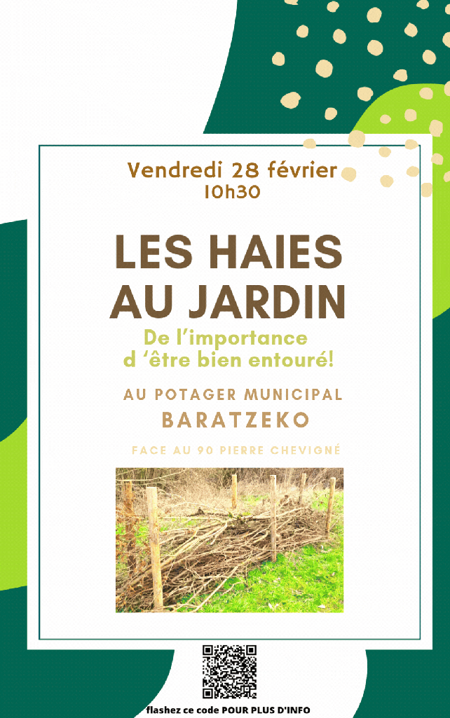 - Le 23 février : Atelier collectif du mois pour préparer le jardin aux cultures estivales on s’est occupé des haies. La haie comestible a été dégagée des adventices.