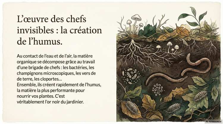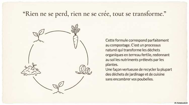 Le compostage incarne le principe naturel selon lequel « rien ne se perd, rien ne se crée, tout se transforme ». Il s’agit d’un processus de décomposition de la matière organique sous l’action combinée de l’eau, de l’air et de divers organismes du sol tels que les bactéries, les champignons, les vers de terre et les cloportes.