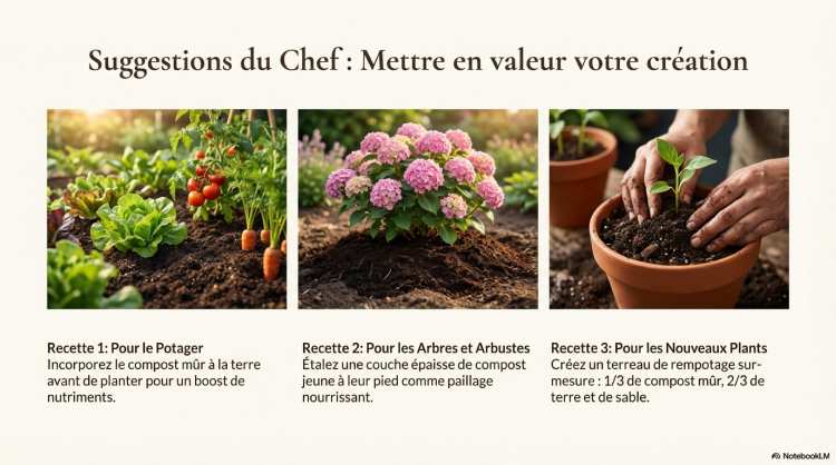 Le produit final évolue en deux stades : un compost « jeune » (4 à 6 mois), utilisable en paillage, et un compost « mûr » (10 à 12 mois), qui sert d’engrais puissant pour le potager ou d’amendement pour les rempotages.