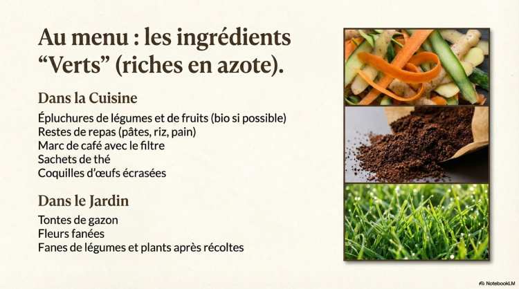 | Déchets Verts | Azote (N) | Déchets de cuisine (épluchures), tonte de gazon, feuilles vertes. |
