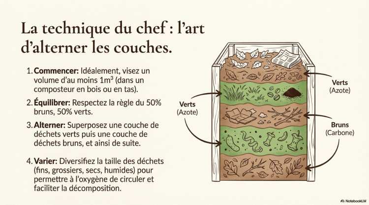 L’équilibre entre le carbone et l’azote est le facteur le plus critique pour un bon compost. La règle d’or est de respecter un ratio de 50 % de matières brunes pour 50 % de matières vertes, en alternant les couches.
