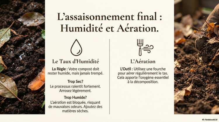 • État Idéal : Le compost doit rester humide en permanence, sans jamais être trempé.