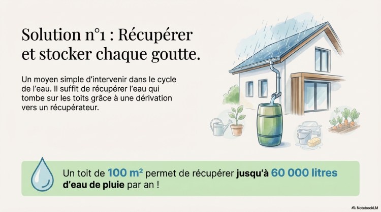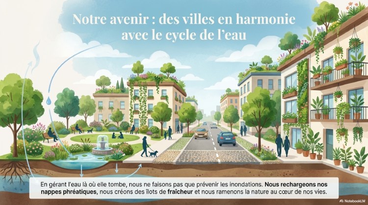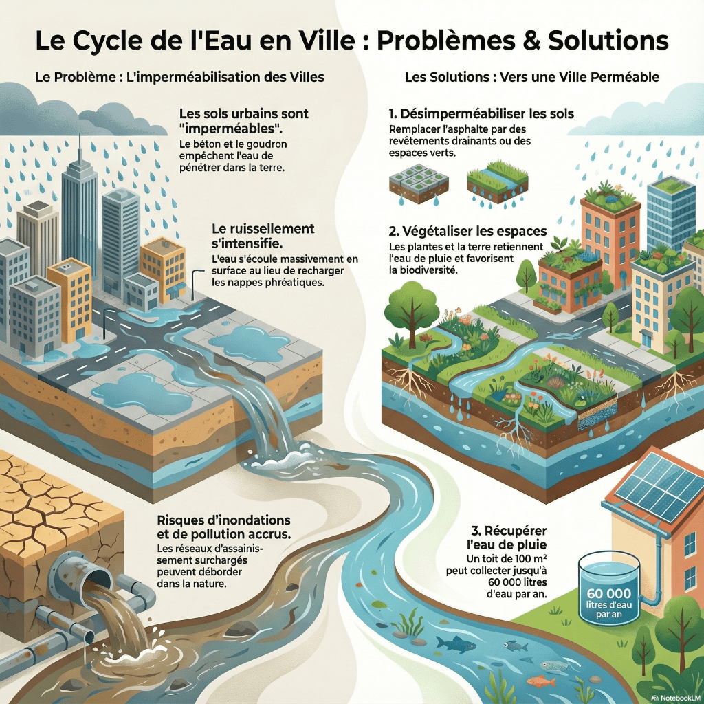 • Récupérer et stocker l’eau : La récupération de l’eau de pluie (souvent des toits ou des gouttières) permet de disposer d’eau sans utiliser le robinet public et d’alléger le réseau . Selon la pluviométrie, un toit de 100 m² peut récupérer entre 3 000 et 60 000 litres d’eau de pluie par an. Comme dans un système de plomberie complexe, l’urbanisation a créé trop de surfaces dures et rigides, empêchant l’eau de s’infiltrer naturellement dans le sol (la « terre-éponge ») ; les efforts de gestion de l’eau visent désormais à réintroduire cette « éponge » dans le paysage urbain pour éviter que le système ne déborde ou ne sature