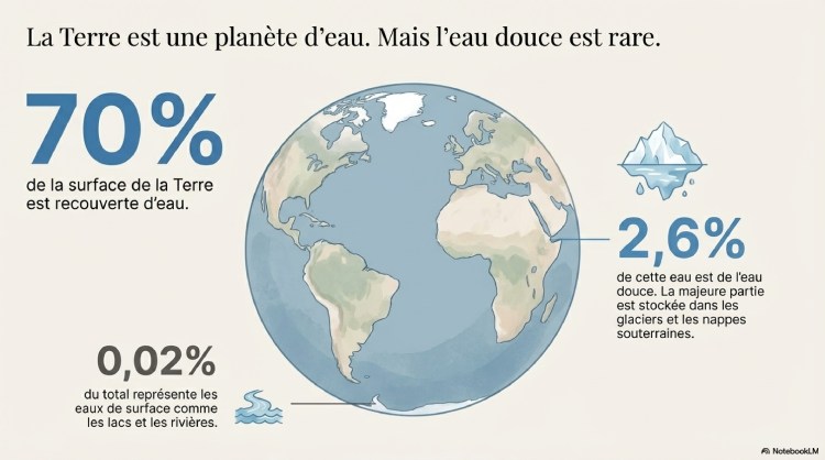 1. Réservoir et Distribution : Bien que 70 % de la surface terrestre soit recouverte d’eau, l’eau douce ne représente que 2,6 % de l’eau totale disponible, dont la majeure partie est stockée dans les glaciers ou les nappes souterraines