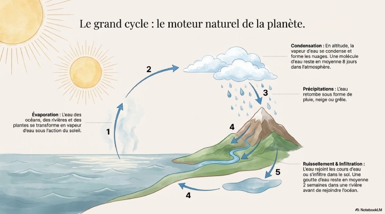 Le grand cycle décrit le recyclage de l’eau douce sur Terre par la machine atmosphérique