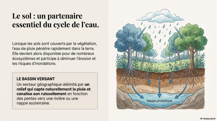 3. Partie Terrestre : Une fois sur terre, l’eau s’infiltre ou s’écoule sur les sols du bassin versant. Un bassin versant est une zone géographique délimitée par le relief qui capte la pluie et canalise le ruissellement vers une rivière ou une nappe souterraine