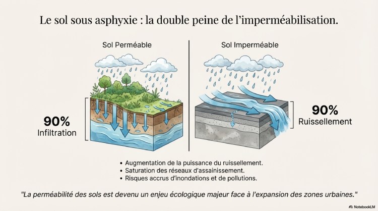 En milieu urbain, l’eau de pluie est nommée eau pluviale lorsqu’elle ruisselle sur le sol. Malheureusement, elle peut se charger de différentes pollutions durant son parcours. L’imperméabilisation des sols est un enjeu écologique majeur. Les revêtements urbains (goudron des routes, parkings, bâtiments) empêchent l’infiltration de l’eau. Ceci augmente la puissance du ruissellement et le volume d’eau dans le réseau d’assainissement, menant à des risques importants d’inondations et de pollutions dues à la saturation des bassins de rétention. Pour lutter contre ce phénomène, l’objectif actuel est de gérer les volumes d’eau sur chaque parcelle par le stockage ou l’infiltration, plutôt que d’évacuer l’eau de pluie dans le réseau d’assainissement