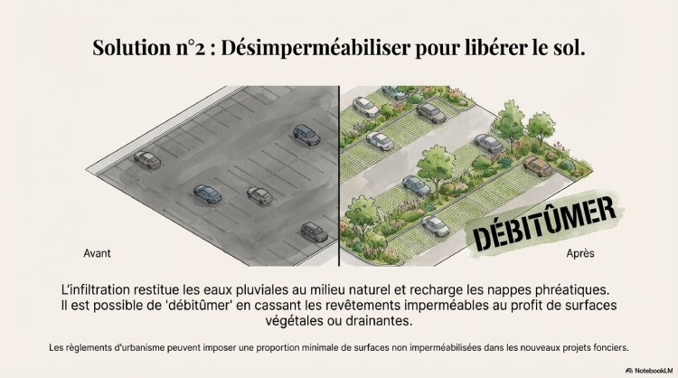 • Désimperméabiliser les sols : L’infiltration recharge les nappes phréatiques et évite la surcharge du réseau d’assainissement. Ceci peut impliquer de « débitûmer » (casser les revêtements imperméables) pour créer des surfaces végétales ou drainantes