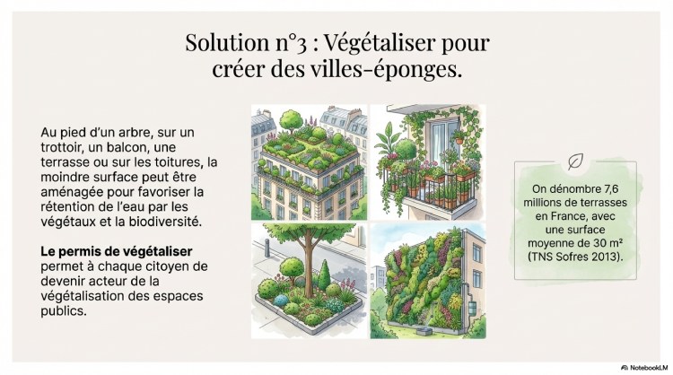 • Végétaliser les villes : Favoriser la rétention de l’eau de pluie par les végétaux, sur les toitures, les terrasses ou au pied des arbres, aide à compenser les effets de l’imperméabilisation et favorise la biodiversité locale