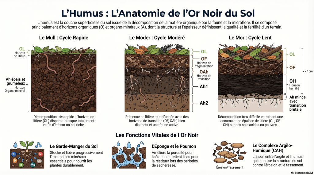 - Processus de formation : Il résulte d’une décomposition biologique complexe opérée par la faune, les bactéries et les champignons, aboutissant à la création du complexe argilo-humique (CAH).
